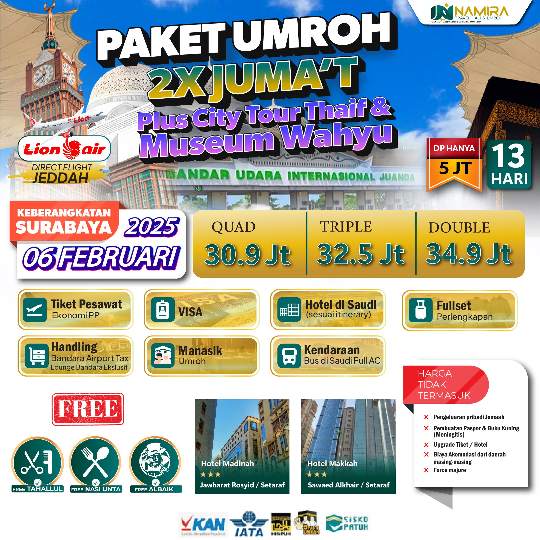 Harga paket tour yg ditawarkan sangat terjangkau. U/ pelayanan dari CS, pesawat, hotel dan pendampingan muthowif the best